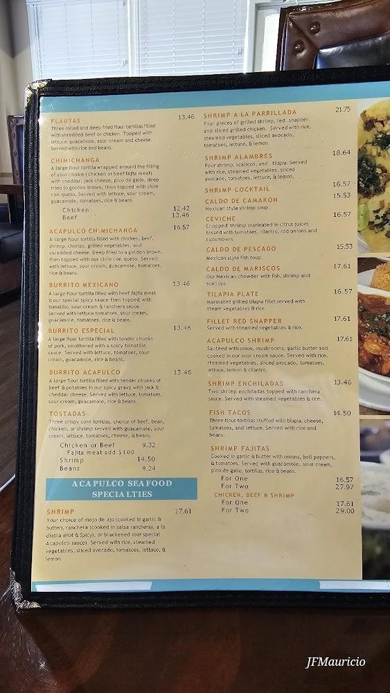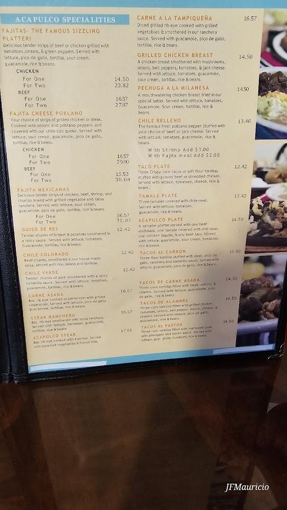 The menu at Acapulco Restaurant showcases a diverse selection of Tex-Mex dishes. Appetizers like taquitos and the appetizer sampler set the stage for a satisfying meal. Coming from the grill, the fajitas are a highlight, prepared fresh and full of flavor. Enchiladas become a fan favorite, with options ranging from cheese to beef and chicken. For lighter bites, vegetarian specialties such as veggie quesadillas provide delicious choices. Desserts like fried ice cream offer a sweet ending to any meal. Snacks like the nachos are perfect for sharing, making them ideal for groups. Drinks are equally enticing, featuring various margaritas and beers to elevate the dining experience. Overall, the menu balances traditional flavors with appealing variety, ensuring everyone finds a favorite here.
